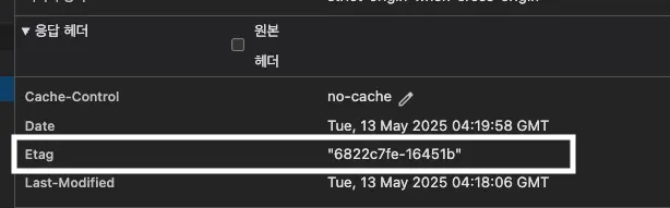 이후 호출에는 요청헤더 값 If-None-Match 에 이전에 요청 했을 때 받은 Etag 값을 넣어서 요청합니다.